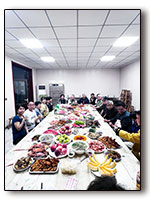 呉老師の80歳祝宴は、本当に盛大でした。体育館が赤い布で飾られ、呉老師を敬い慕う来賓やお弟子さんたちが笑顔で祝福を送ります。呉昊(ウー・ハオ)老師の特別表演もあり感無量。中秋節の晩餐会では、ご家族やお弟子の老師、訓練生も一緒に揚げ魚と香味野菜、牛肉の煮込み、手作り点心、月餅、スイカやざくろマンゴー等の果物が所せましに積み上げられた食卓を囲み、世代を超えての交流が広がる平和で幸せな空間でした。小さな曾孫さんが老師の肩車で遊ぶ姿に、場の空気が一層和やかになります。外では中庭で2から3Mもあるような棍で腕比べ。孟村のみなさんは、礼儀を重んじ、互いを敬いながら笑顔で接していて、時折日本に行ったことあるよ、日本語でどういうのなど声をかけてくれます。強さと優しさが自然に共存しているのが印象的でした。