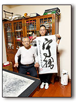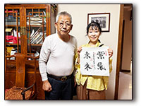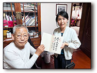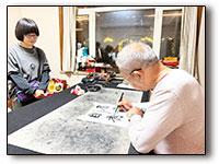 呉連枝老師が一人一人の顔を見てインスピレーションで書を書いてくださるという事で、私も一筆書いていただきました。カッと目を見開いて私の顔を数秒見ただけですらすらと「紫氣東来」という言葉を戴きました。意味はよくわかりませんが、美しい色合いを感じます。感激です。ありがとうございます。