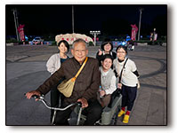 その夜、メインの立派な体育館「八極拳展演舘」を呉連枝老師自ら案内してくださいました。その後、なんと老師の三輪車の後ろに乗せてもらって宿舎まで送って頂くという信じられない体験をさせていただきました。世界的に有名な呉連老師は、もの凄く優しく、ユーモアがあって、どこか可愛く感じました。